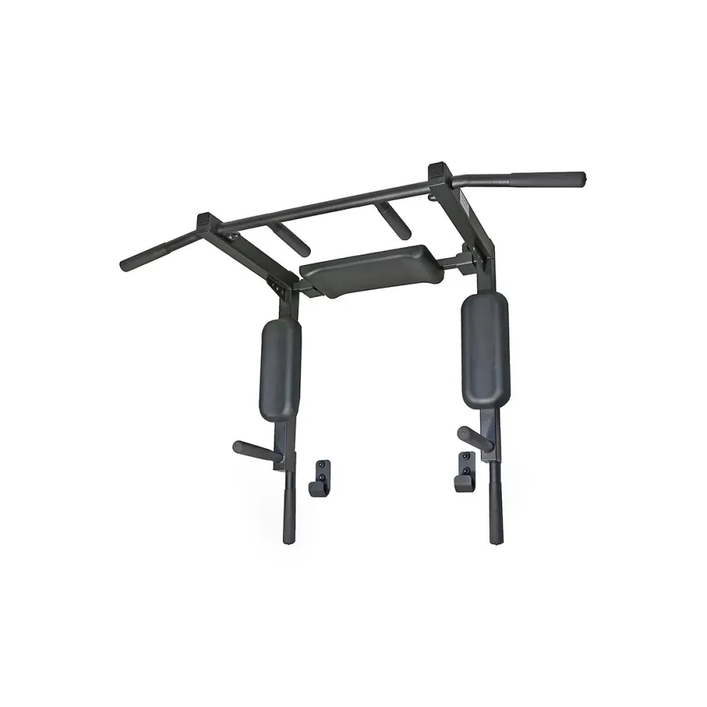 Attrezzo multifunzione reversibile da agganciare a parete, con parallele dotate di prese e appoggi per addominali in sospensione e DIP combinate con sbarra per trazioni con doppie prese. Sono comprese due coppie di punti di aggancio da fissare a parete mediante tasselli ad espansione (esclusi, vedi prodotti correlati), posizionabili all'altezza desiderata.