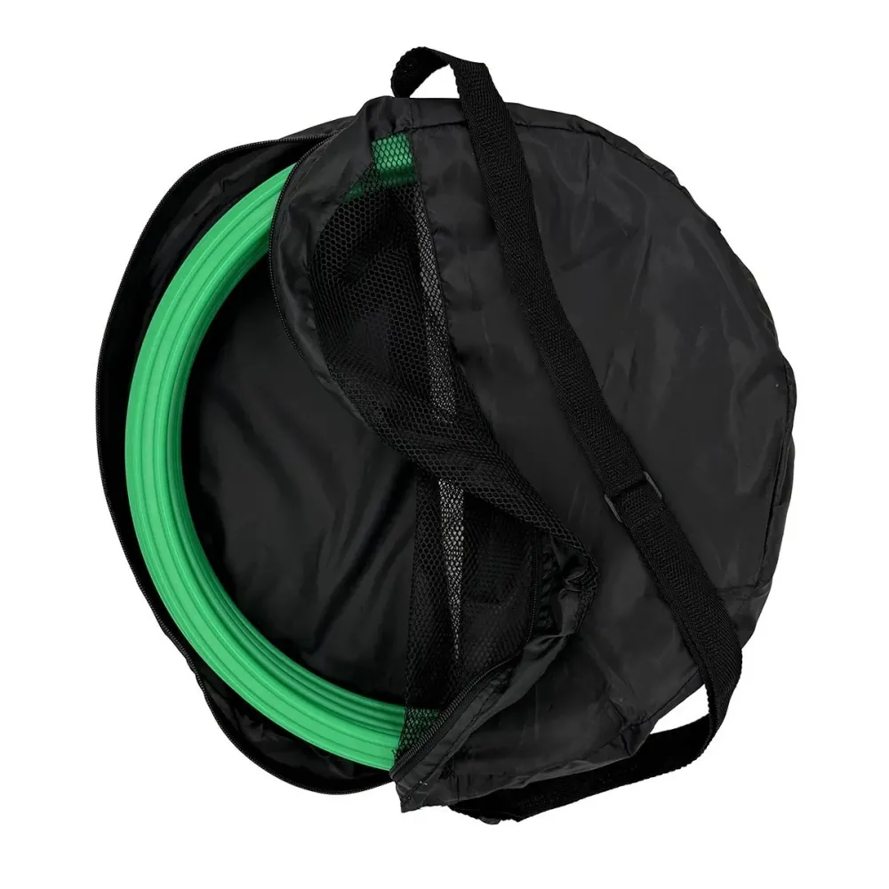 Set composto da 10 cerchi monocolore in nylon a sezione piatta, flessibili, adatti per creare percorsi a terra o tridimensionali, utilizzando gli appositi incavi presenti sulla sommità dei coni o collegati alle aste mediante le clip ad incastro (codice 0012N).